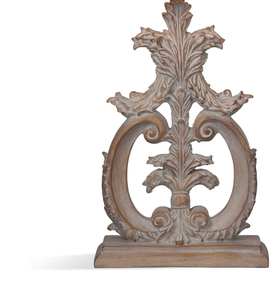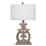 The Abigail Table Lamp is crafted with an ornately carved wood lamp body. The brown, whitewashed wood lamp is completed with a rectangular white linen 19x10 lamp shade.