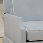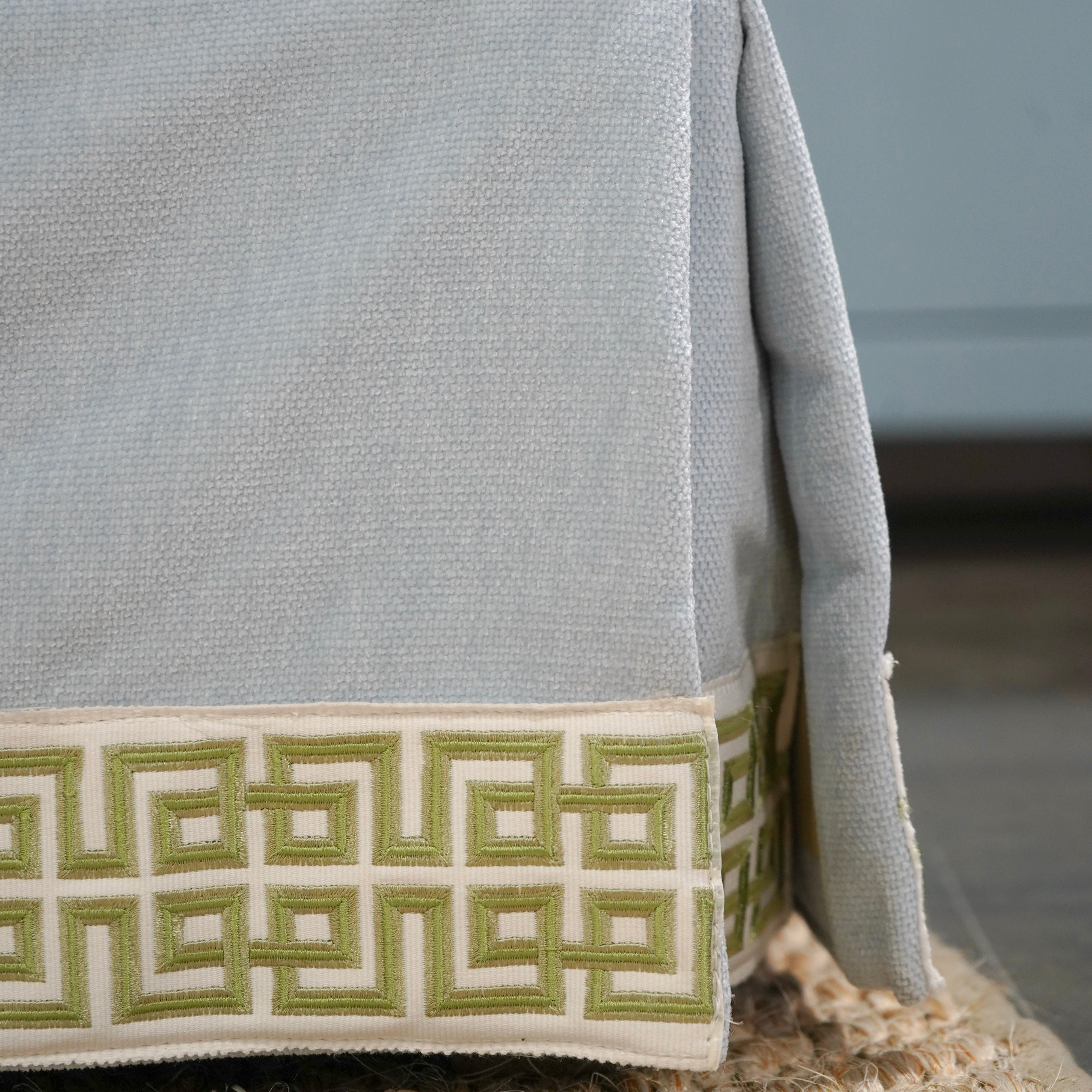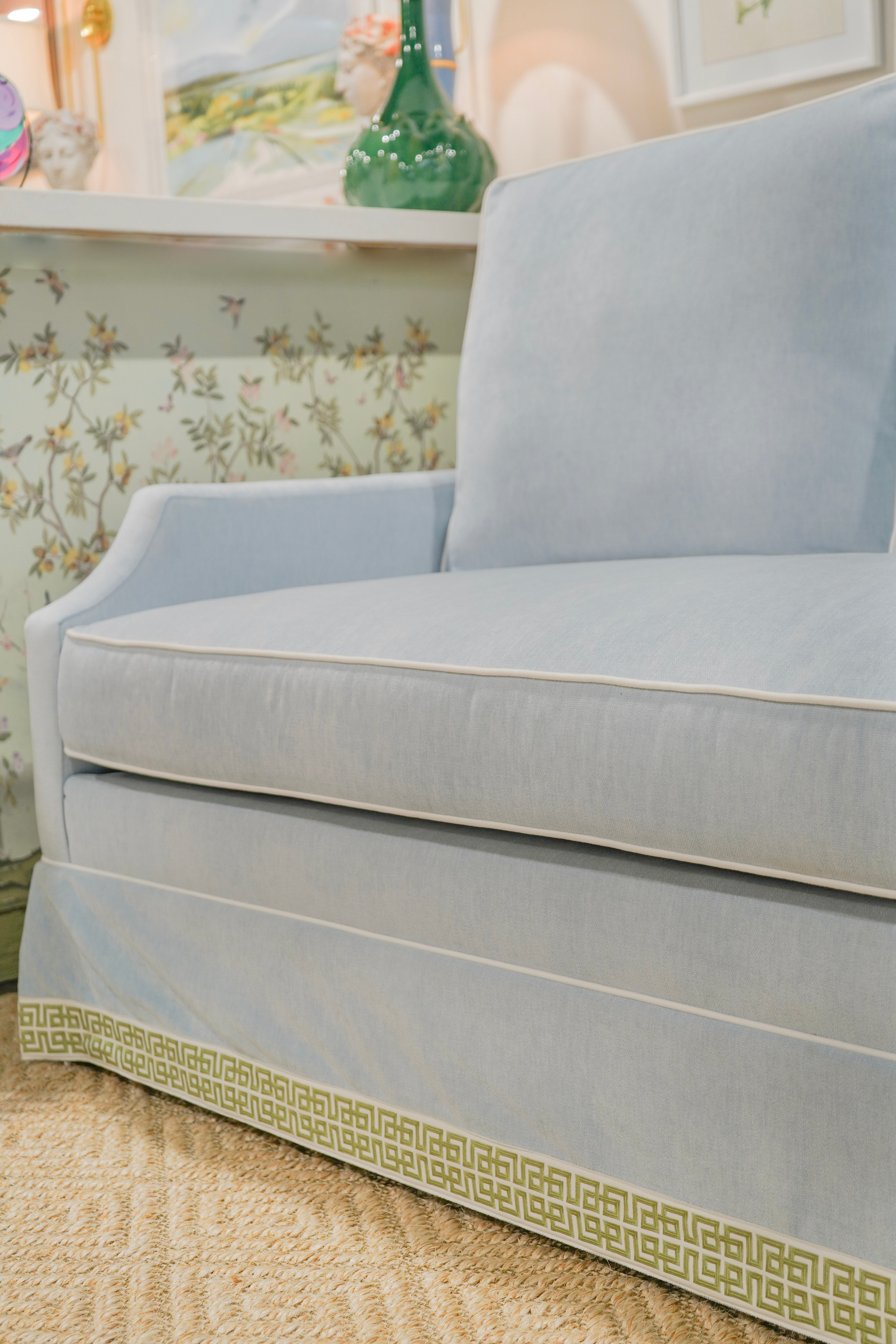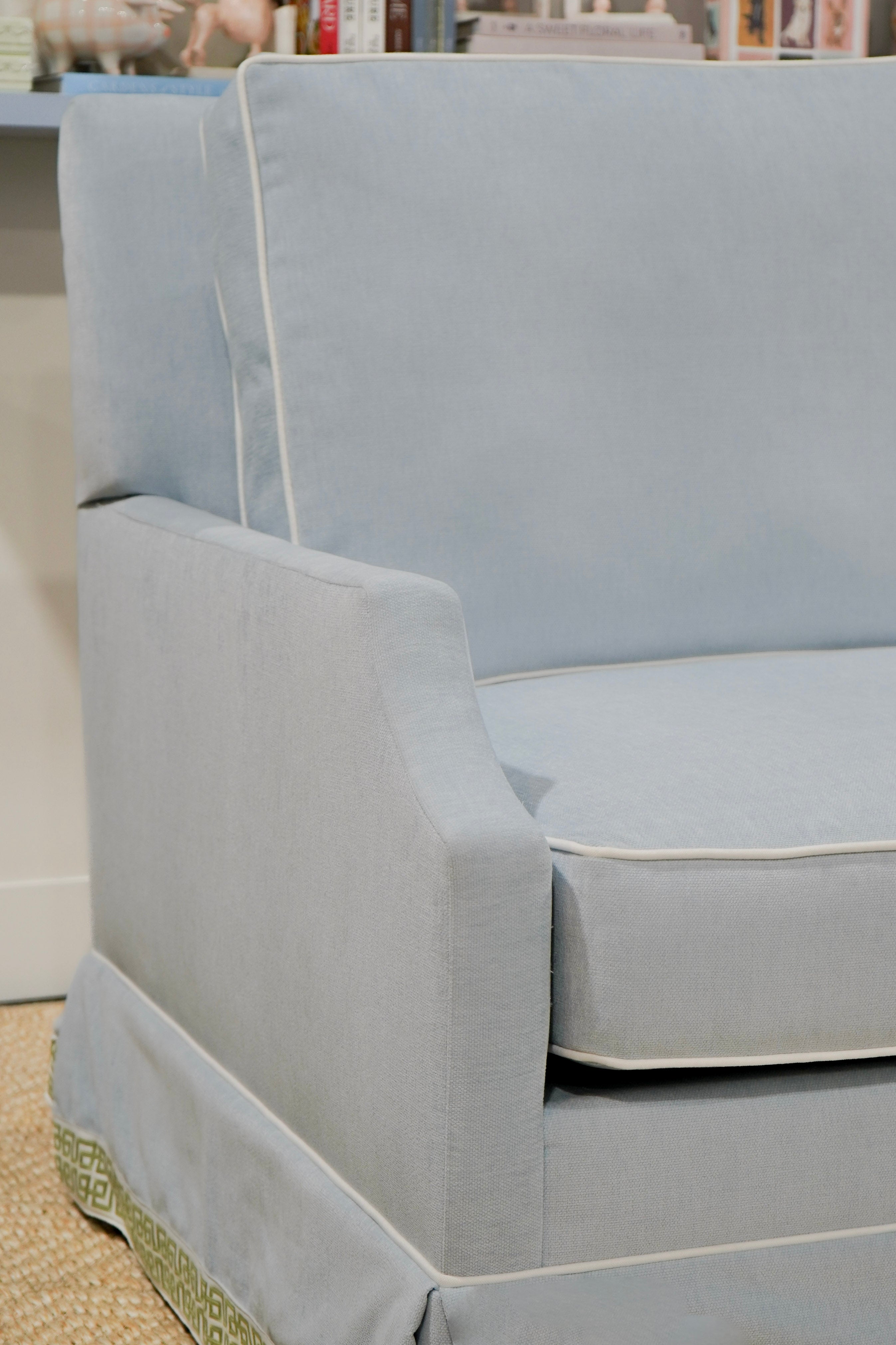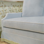 Our classic Alice Sofa in Misty Sky (Performance) with custom trim. Spring Down Bench Seat. The perfect everyday sofa available now! Easy to Clean! Ships in 6-8 weeks!