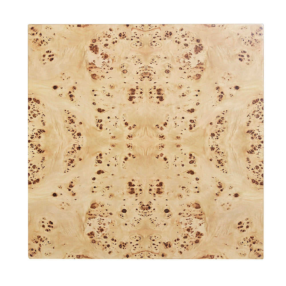 Our Beaumont Side Table features a smooth top, decorative arches, and open lower storage; Clear finish on Mappa burl veneer.