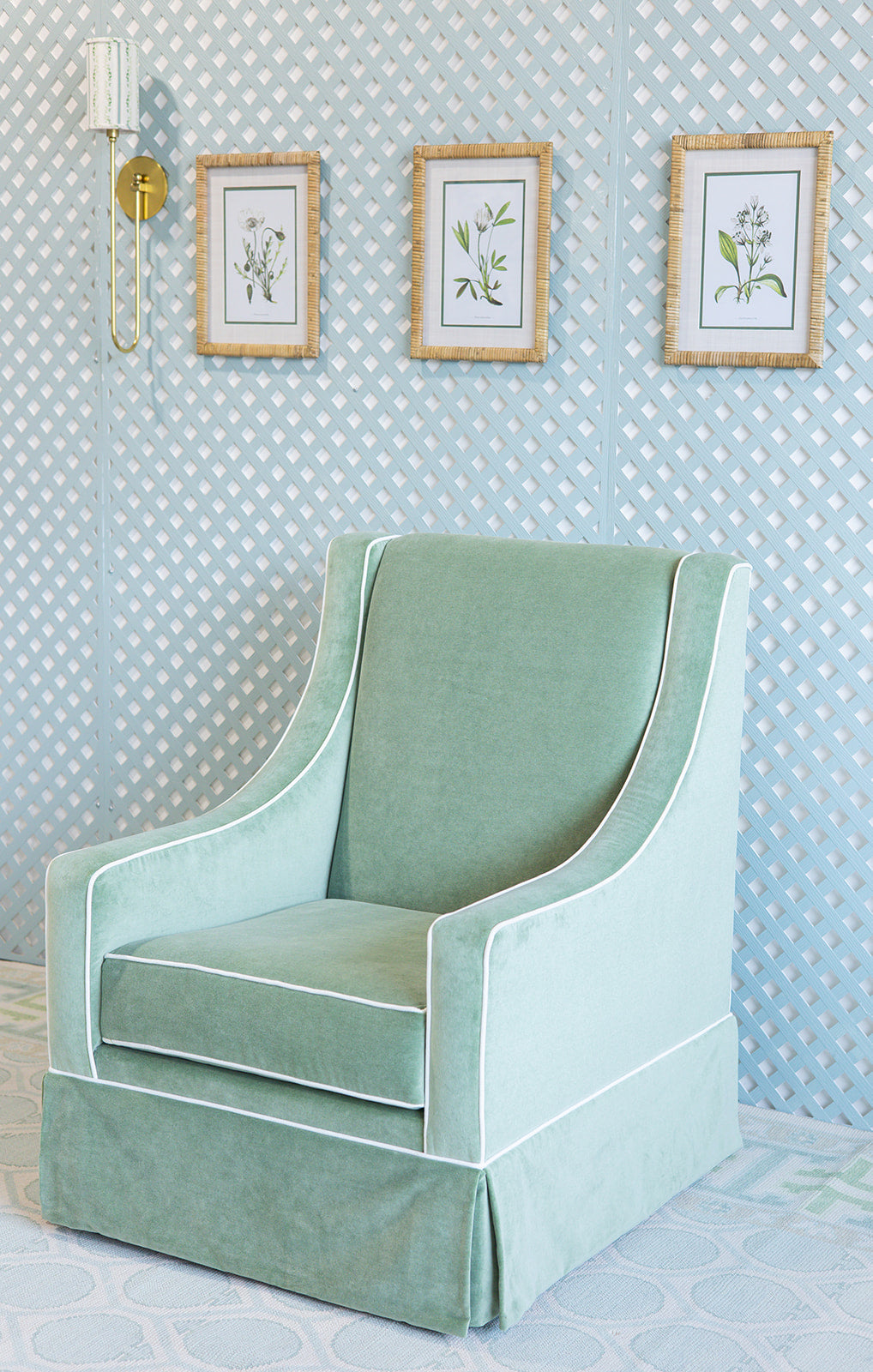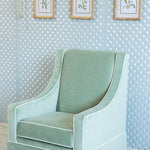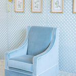 Timeless yet contemporary. The Charlotte Lounge Chair combines timeless elegance with its tight back and rich velvet fabric to a contemporary twist with the swivel glide mechanism. With contrast piping at every seam and engineered foam seat cushions, the Charlotte is built for long-lasting density and shape. Shown here in Lulu Sage and Lulu Ocean with white contrast piping.
