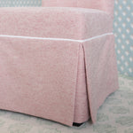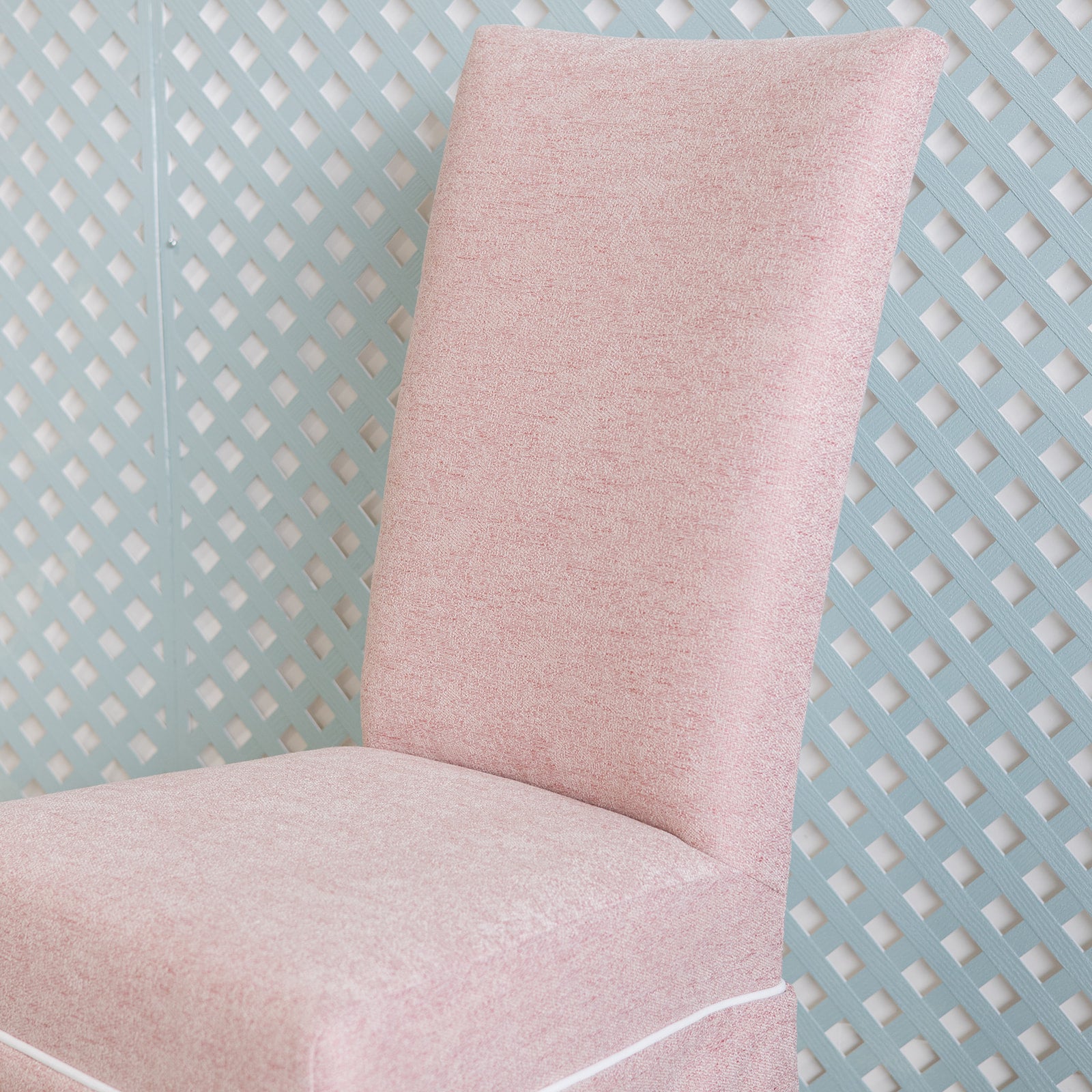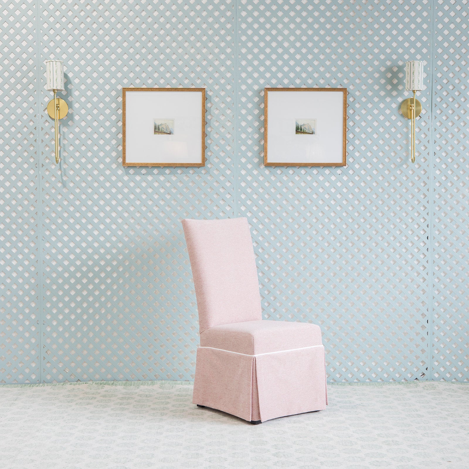 Our Collette Dining Chair features a gracefully tailored skirt that drapes beautifully, adding a touch of sophistication to any dining space. The high backrest and plush cushioned seat provide exceptional support and comfort, making it perfect for long dinners and gatherings. Shown here in Prisma Himalayan.