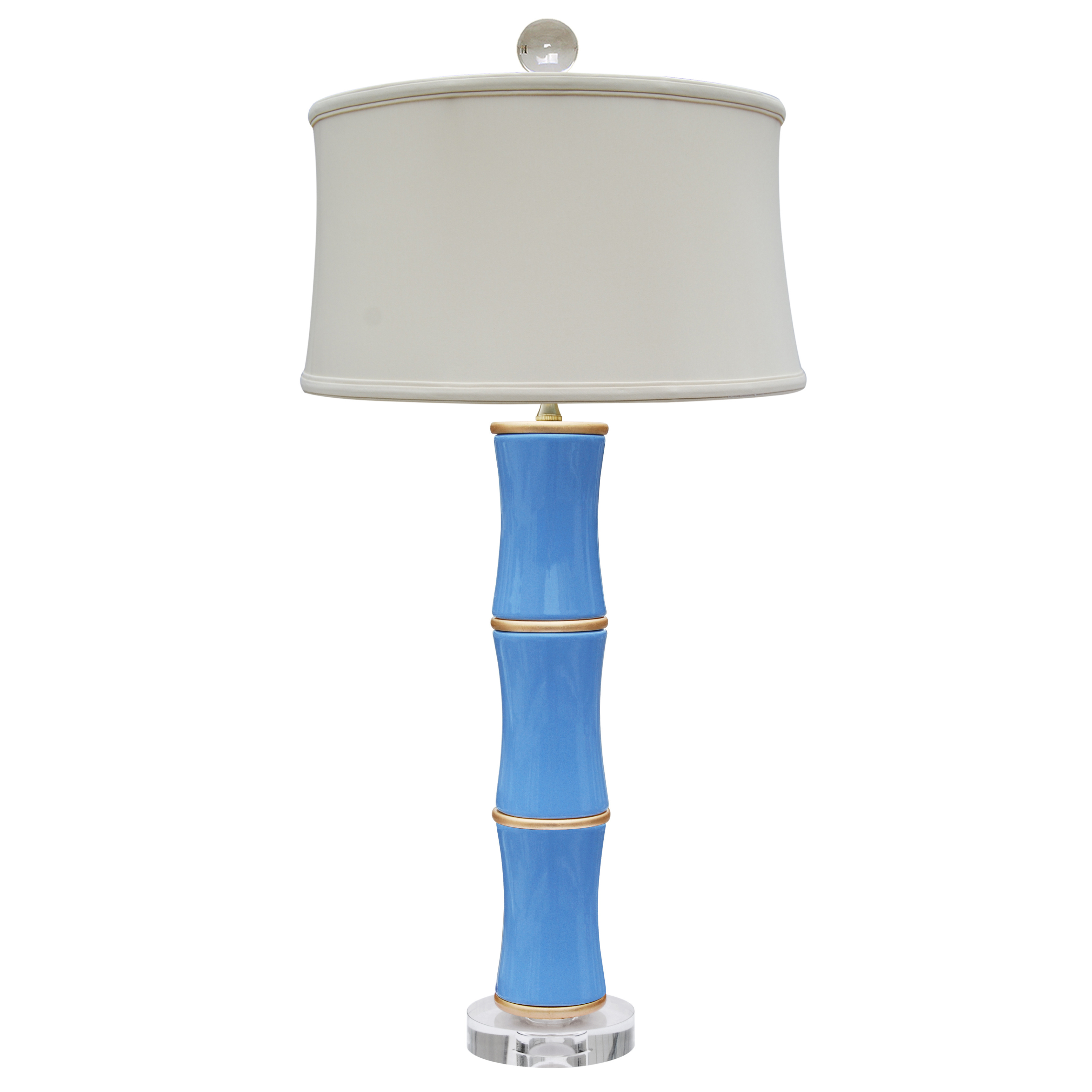 Bring in a rich blue with our Prince Table Lamp. A contemporary acrylic base and banded shade add to its elegant height and gold accents.