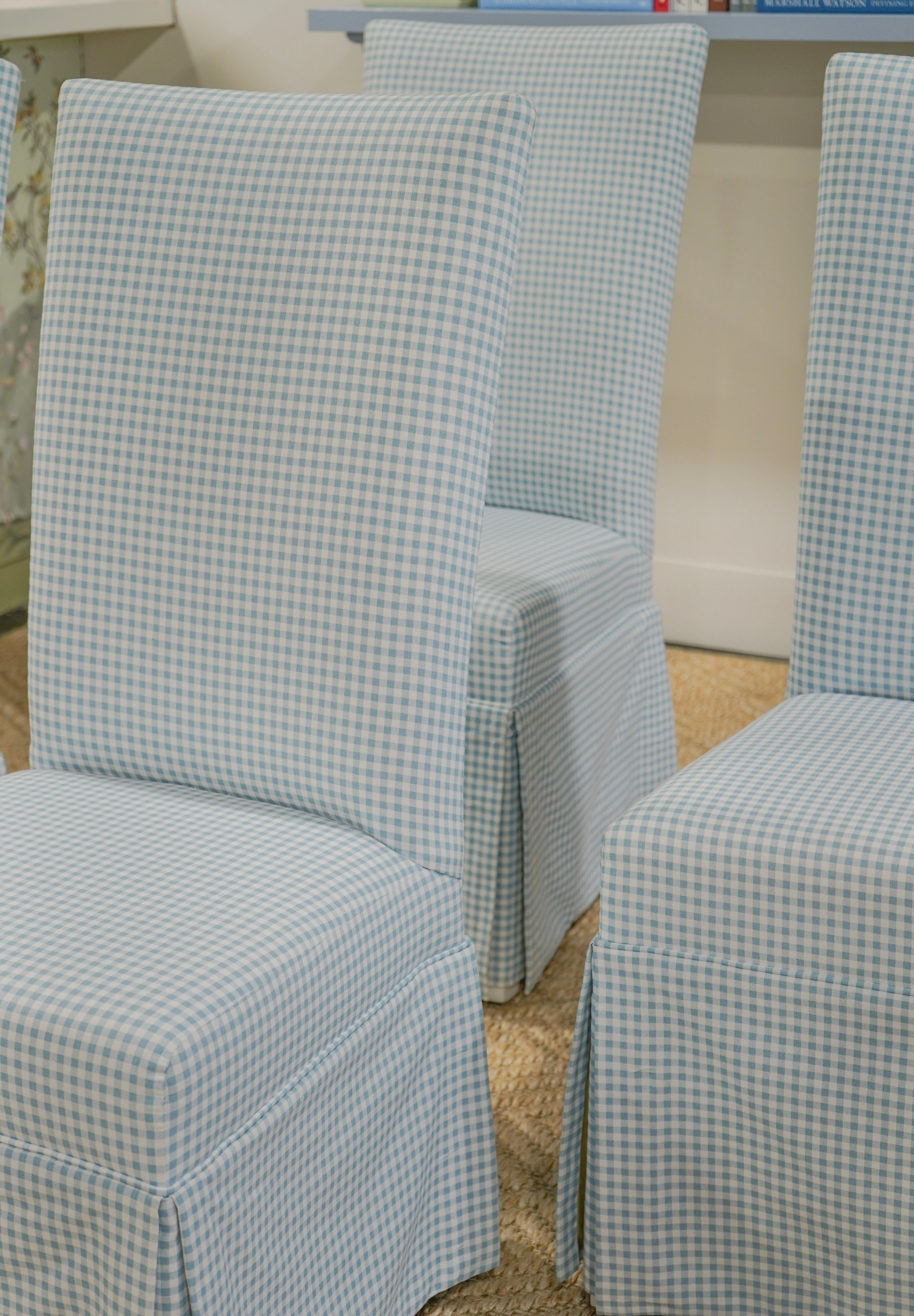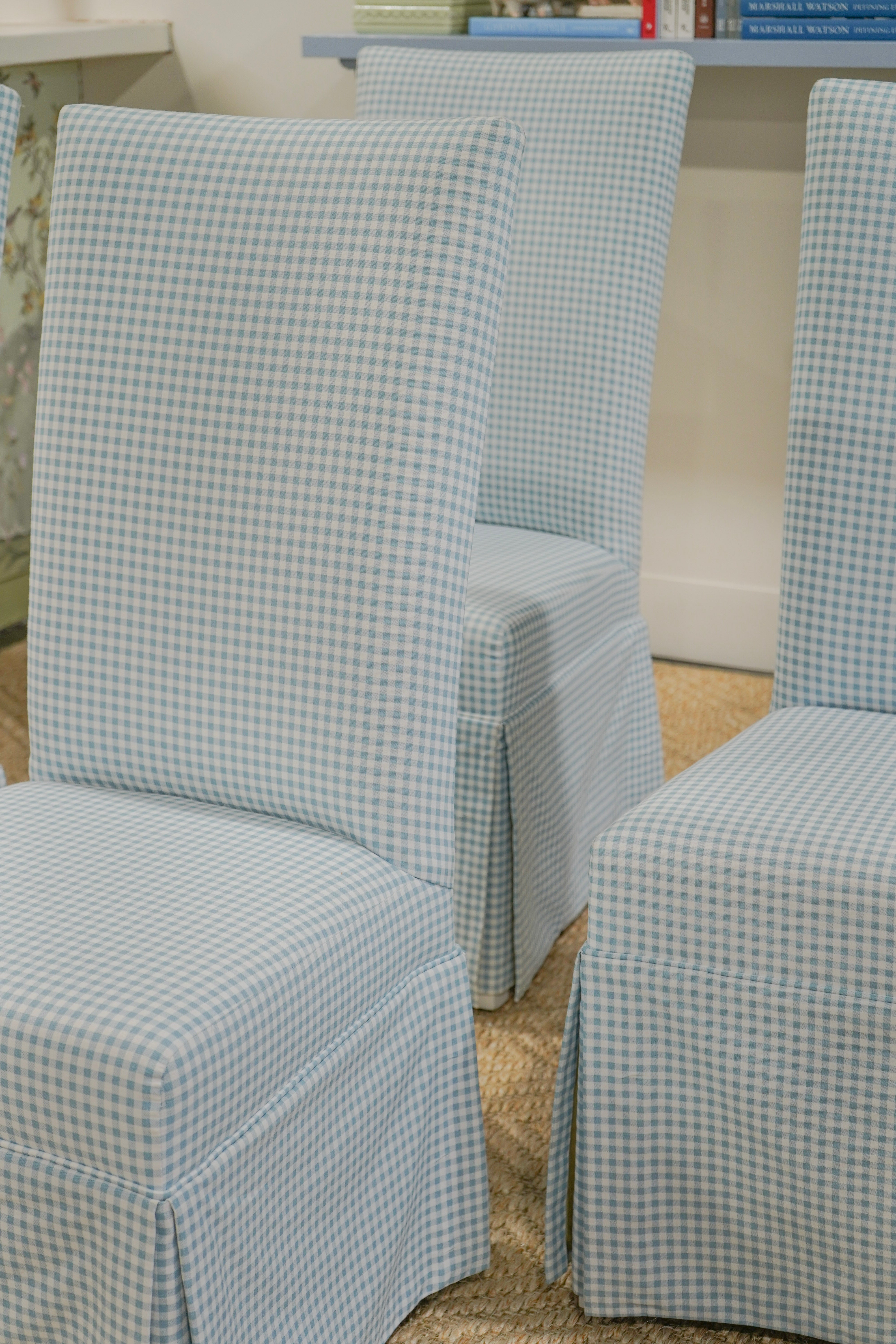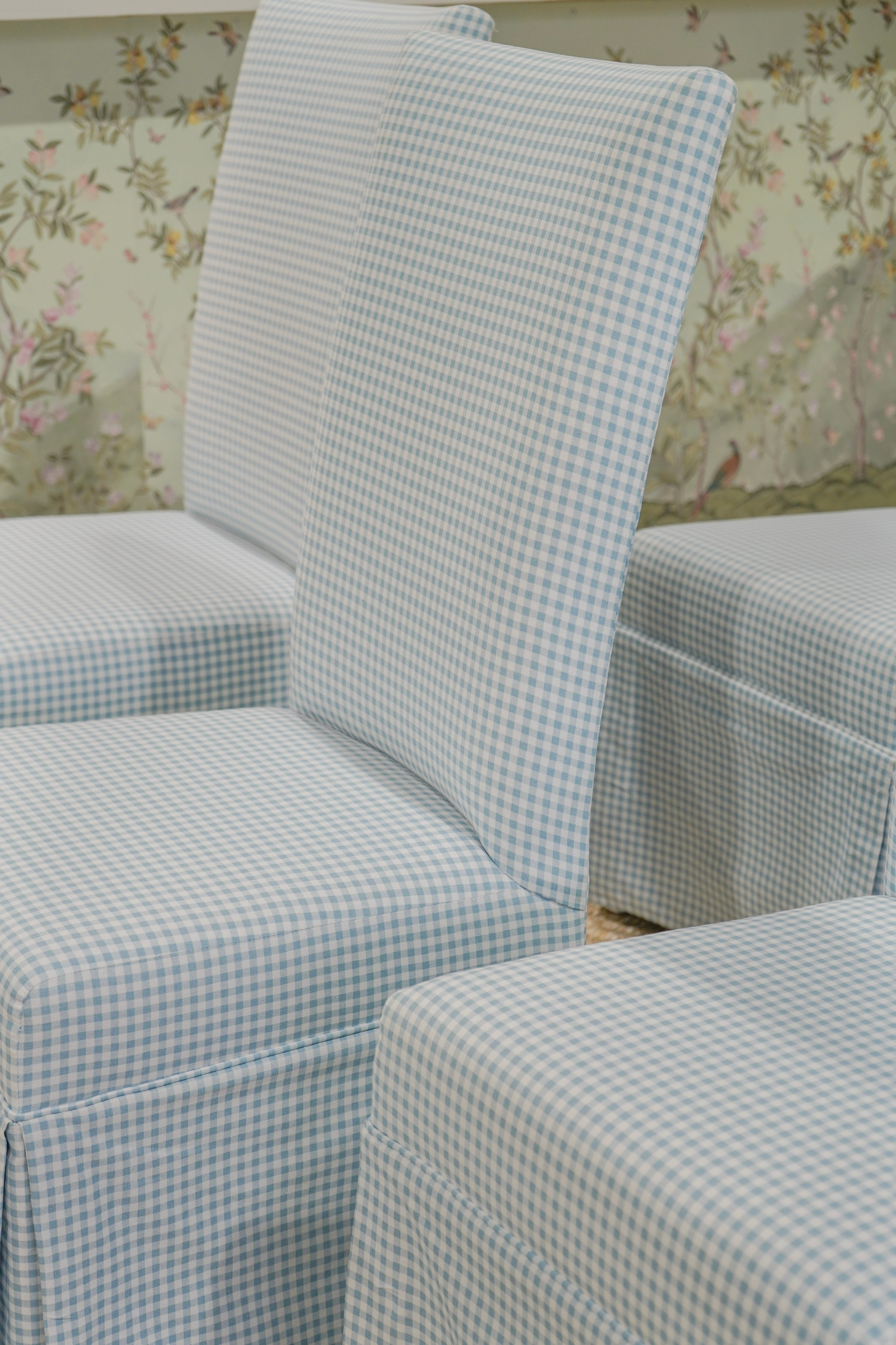 Our Darby Dining Chairs in Sky Gingham ready to complete your table! Sold in a set of 4. Originally $850. On sale for $650/ea
