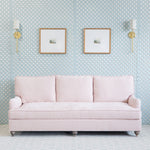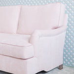 Available now! Classic English style with a twist. The Ellie Sofa is a best seller for a reason, the soft English roll arms paired with caster legs make for a statement piece guests won't forget. Talk about comfort, spring-down cushions plush for lounging. In Amigo Blush with magenta contrast piping.