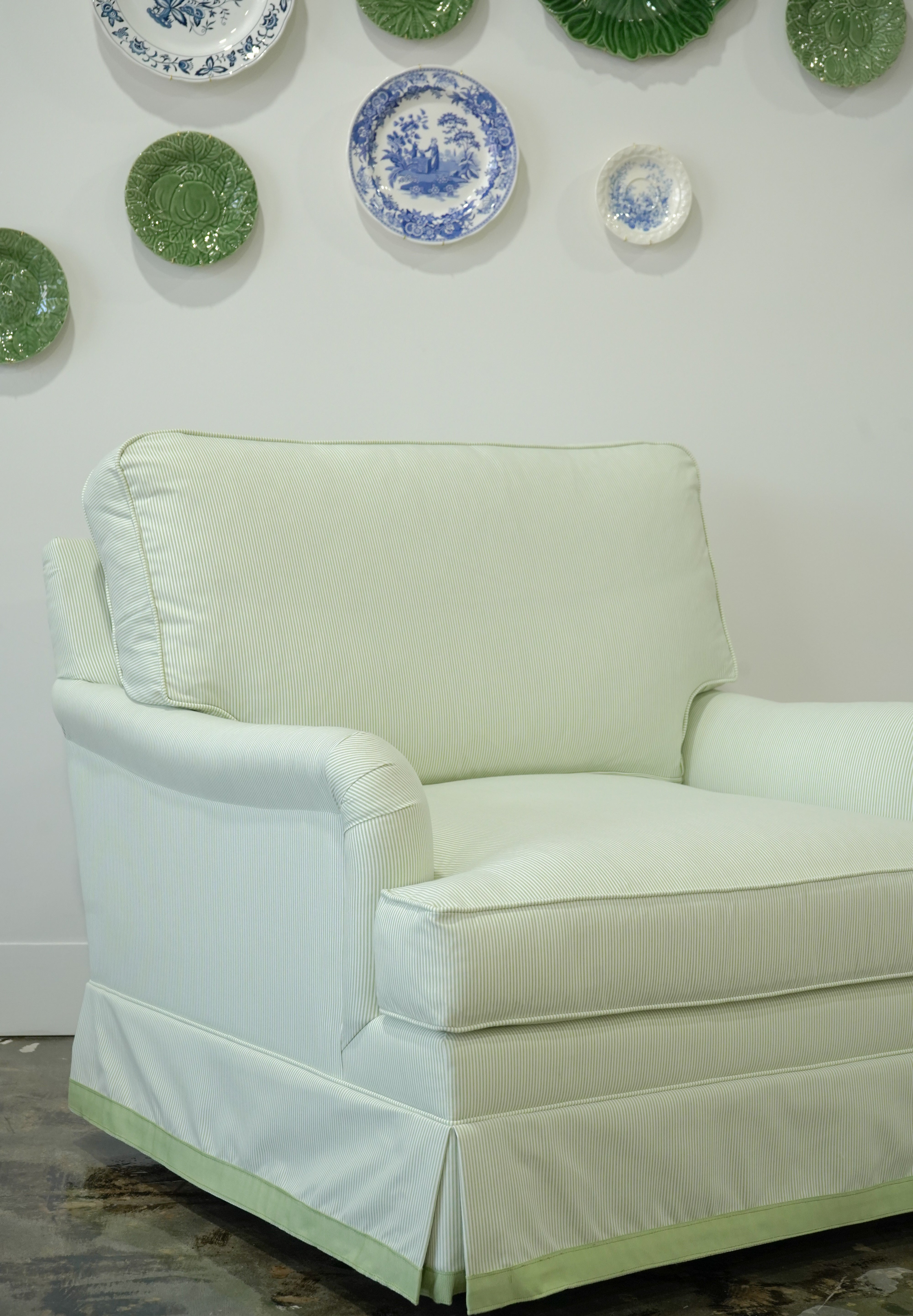Available now! The signature Ellie look, now in swivel form. A versatile chair that brings both style and comfort to any room. In Zesty Stripe with Green Trim.