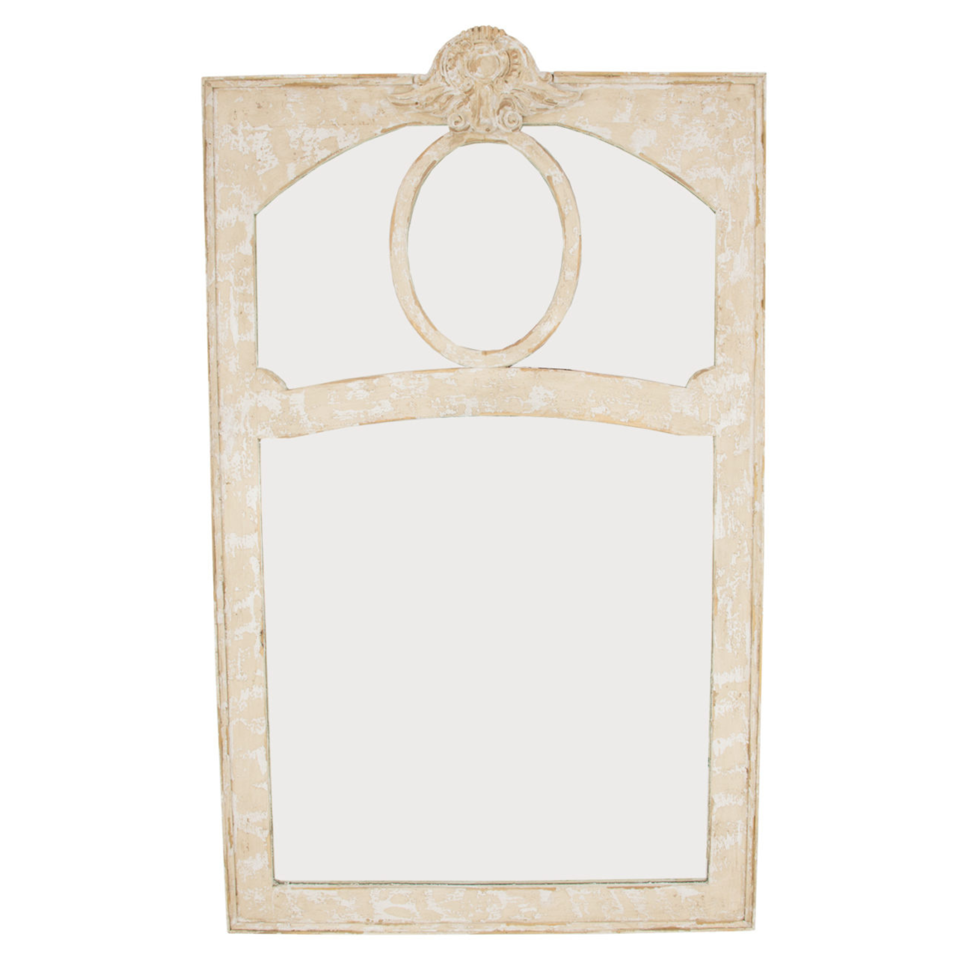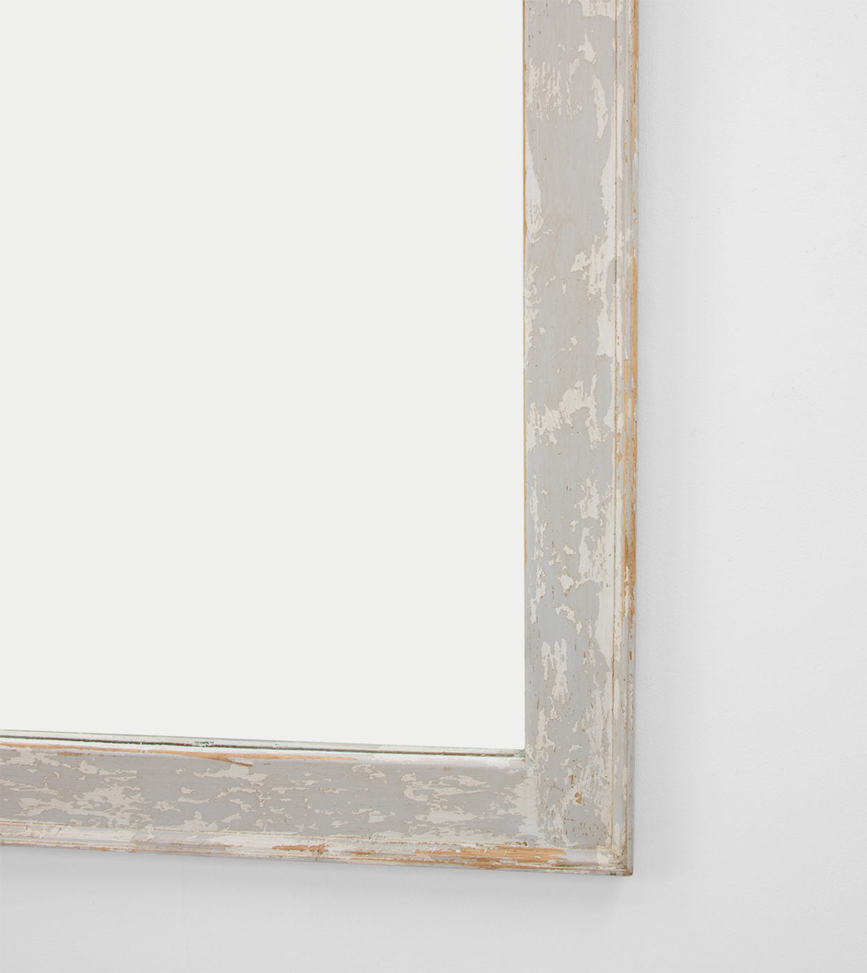 Handmade and hand painted reclaimed wood frame mirror with a distressed taupe cream or grey color and an off white distressing.
