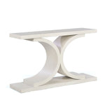 Our Gwendolyn Console features a smooth, thick top and a curved pedestal base; Hand-painted Egret finish on Acacia crown cut veneer and solids