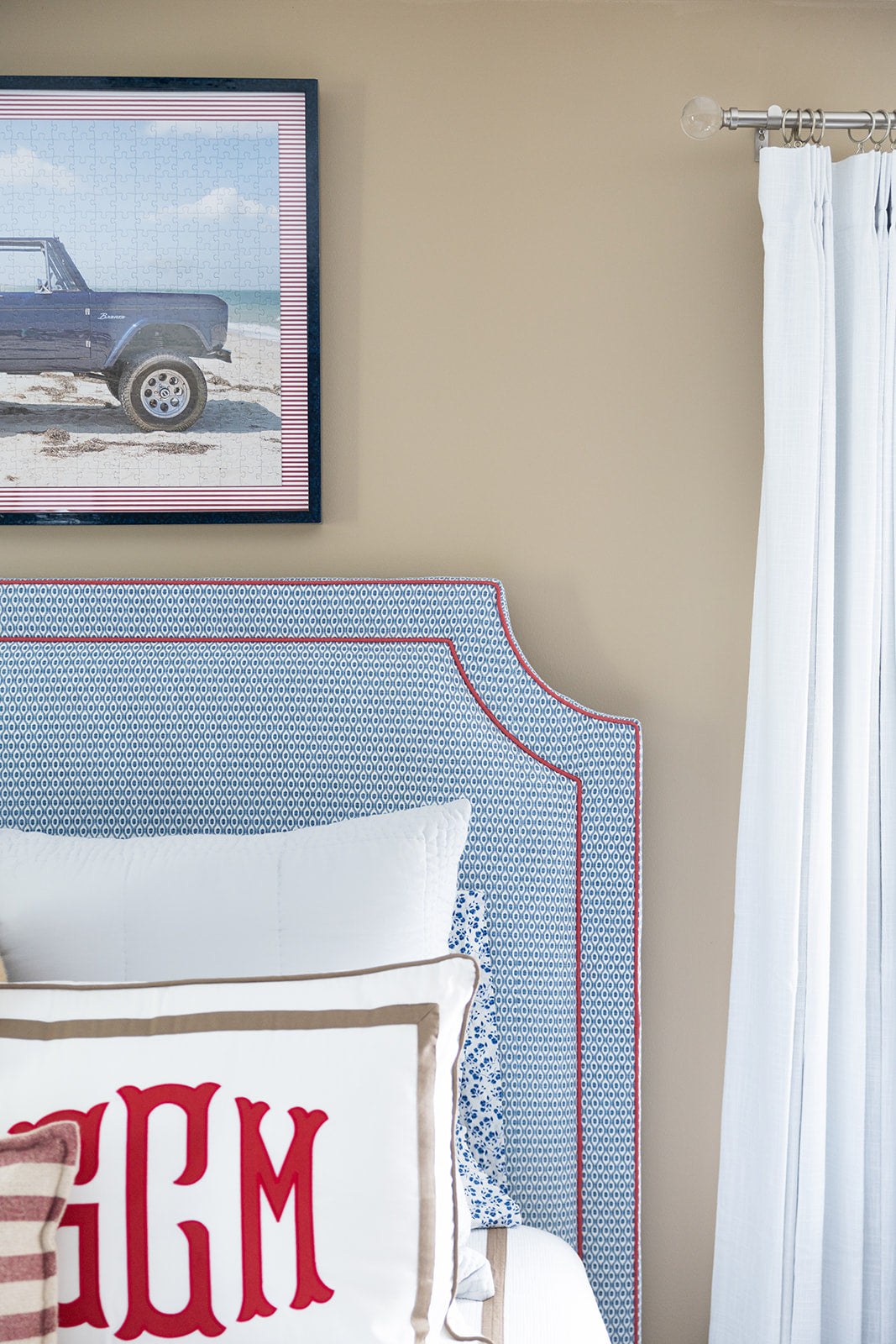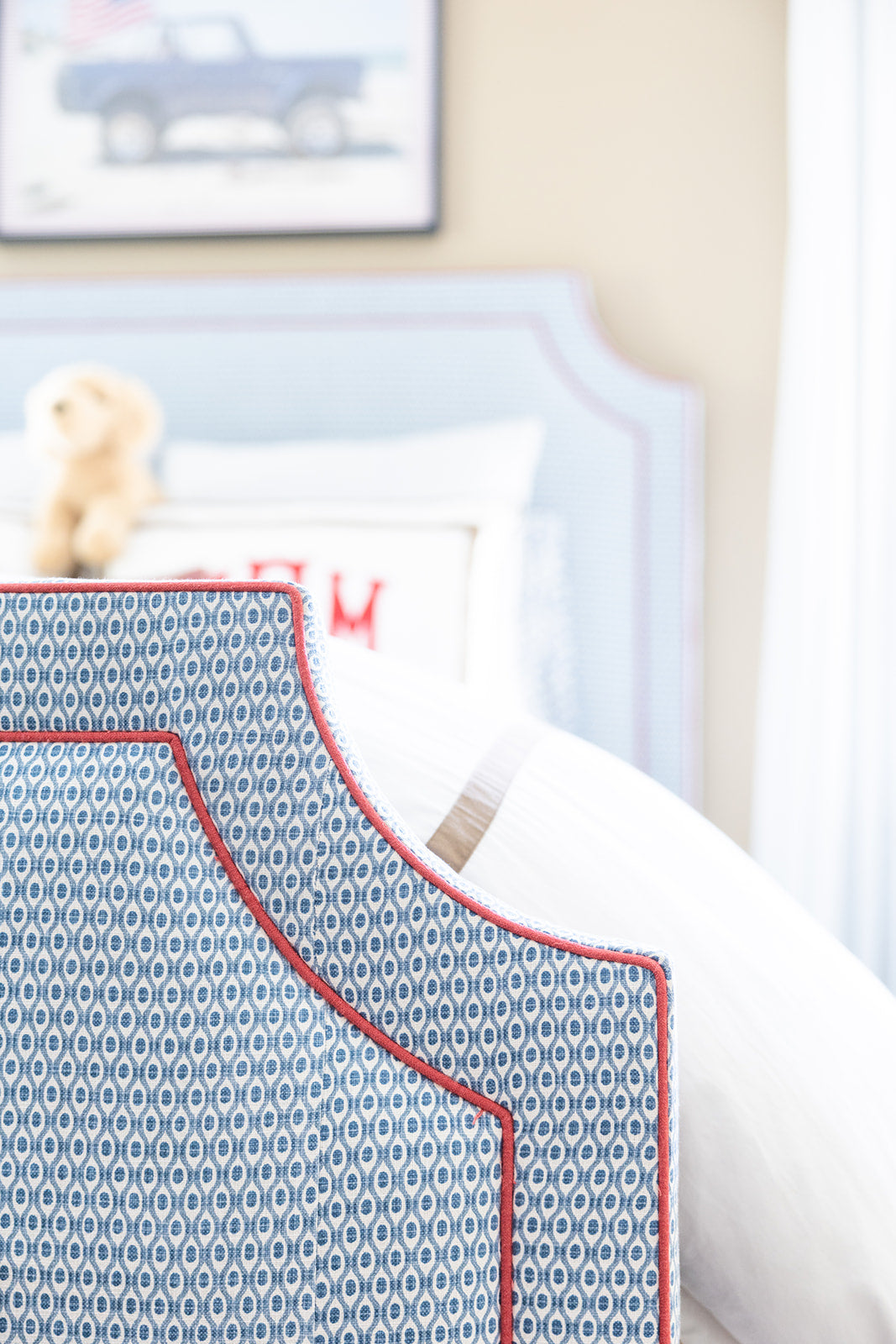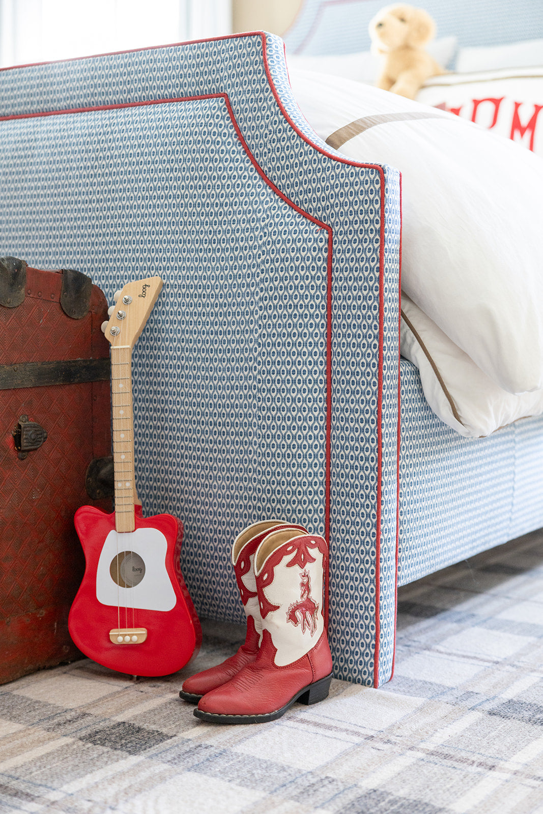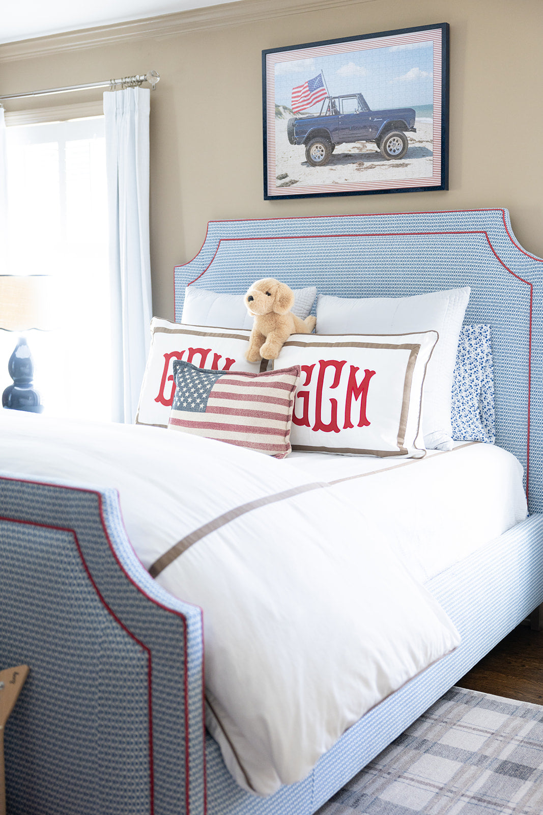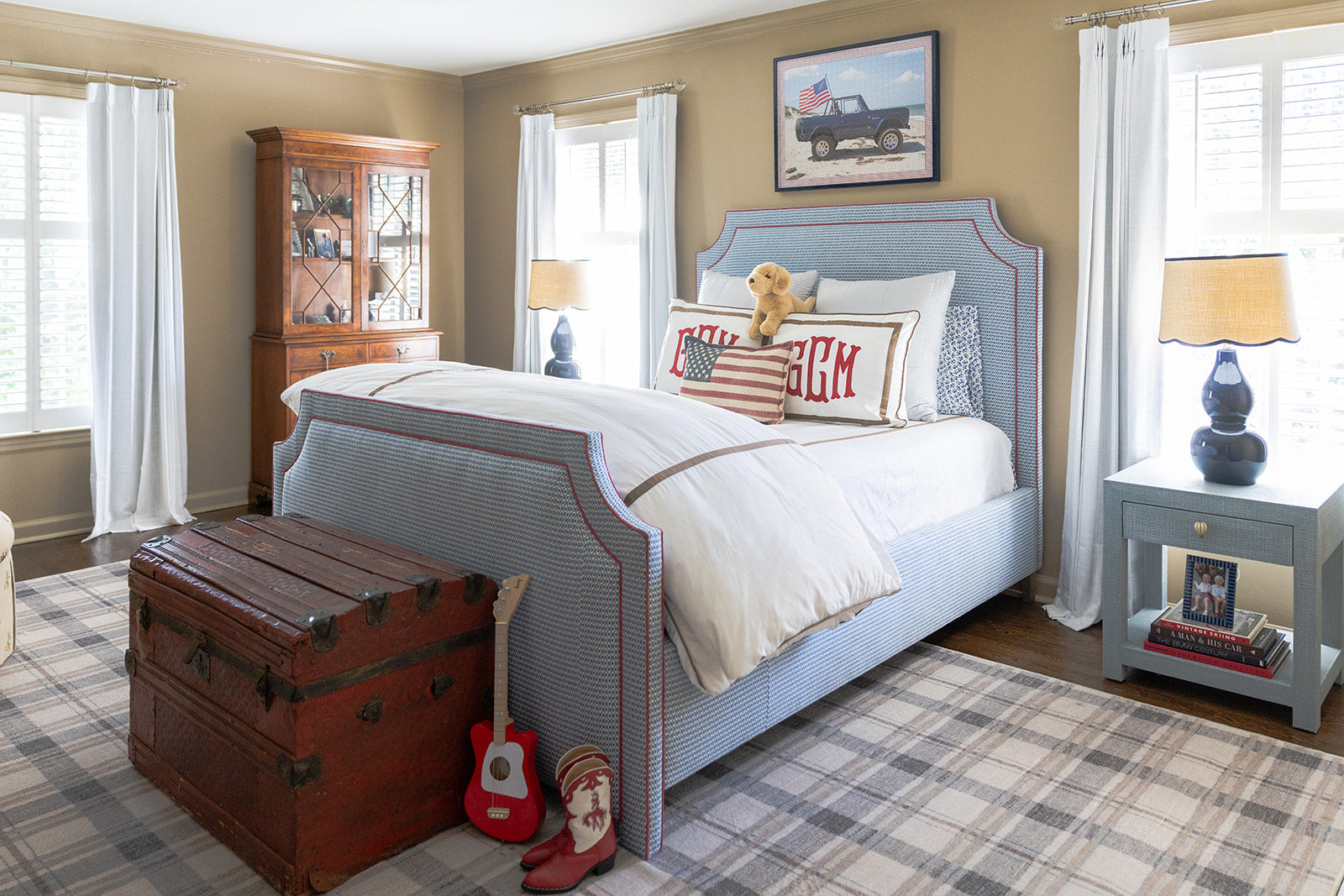 Designed in collaboration with Darby Clark, this statement bed reimagines a classic All American palette in a refined, timeless way. Fully upholstered in a Kravet motif from headboard to footboard, the silhouette is finished with a tailored red contrast welt that adds crisp definition against its soft upholstery. Thoughtful and collected, this piece brings an Americana-inspired charm that feels fresh, layered, and effortlessly livable. Ships in 6-8 weeks.
