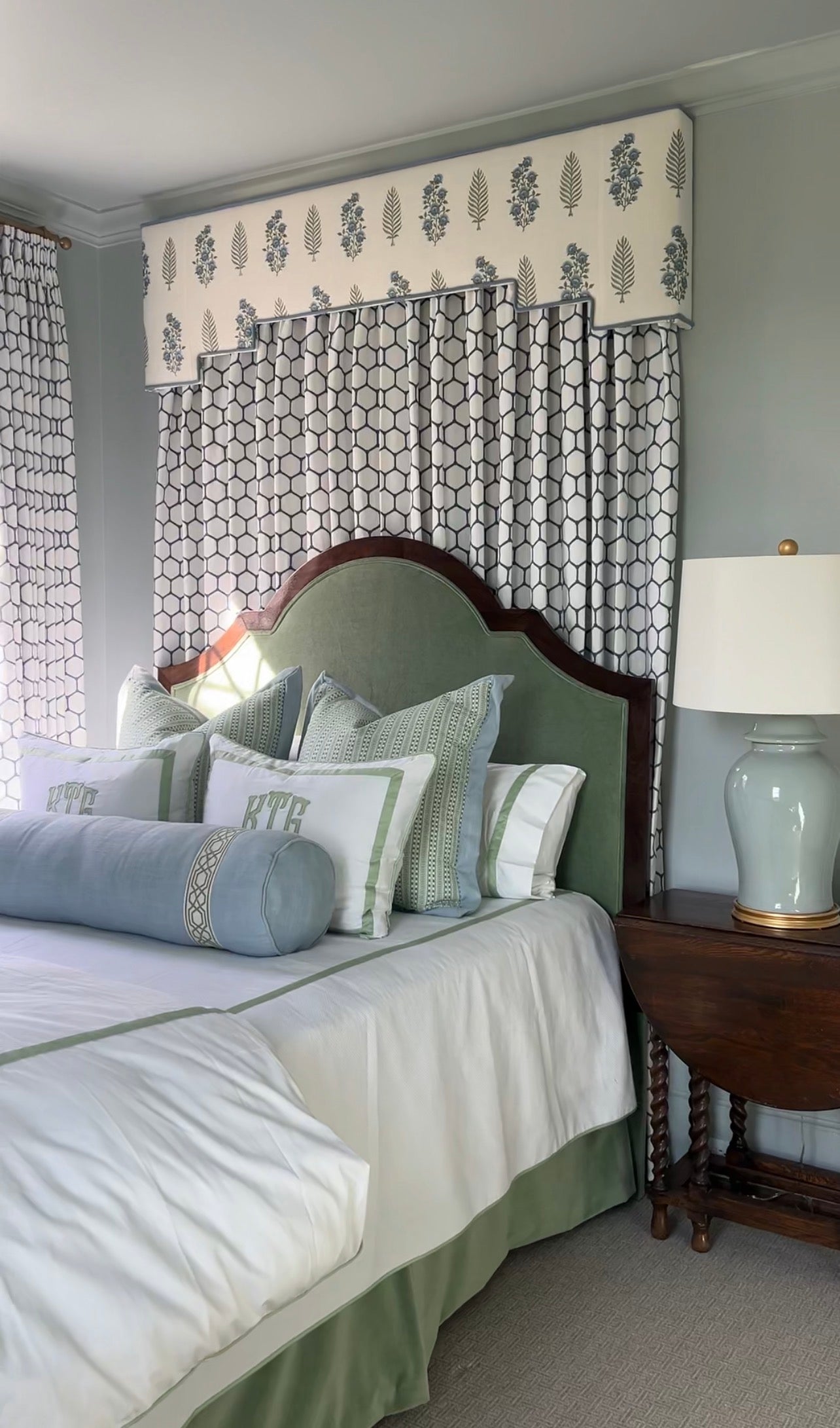 Meet the Sadie Headboard in our lush Lulu Sage velvet—a Mae Davis Interiors exclusive that brings a fresh, tailored elegance to any bedroom. Graceful curves soften the silhouette, while warm mahogany wood trim adds that refined traditional touch we love, creating a layered look that feels both timeless and modern.