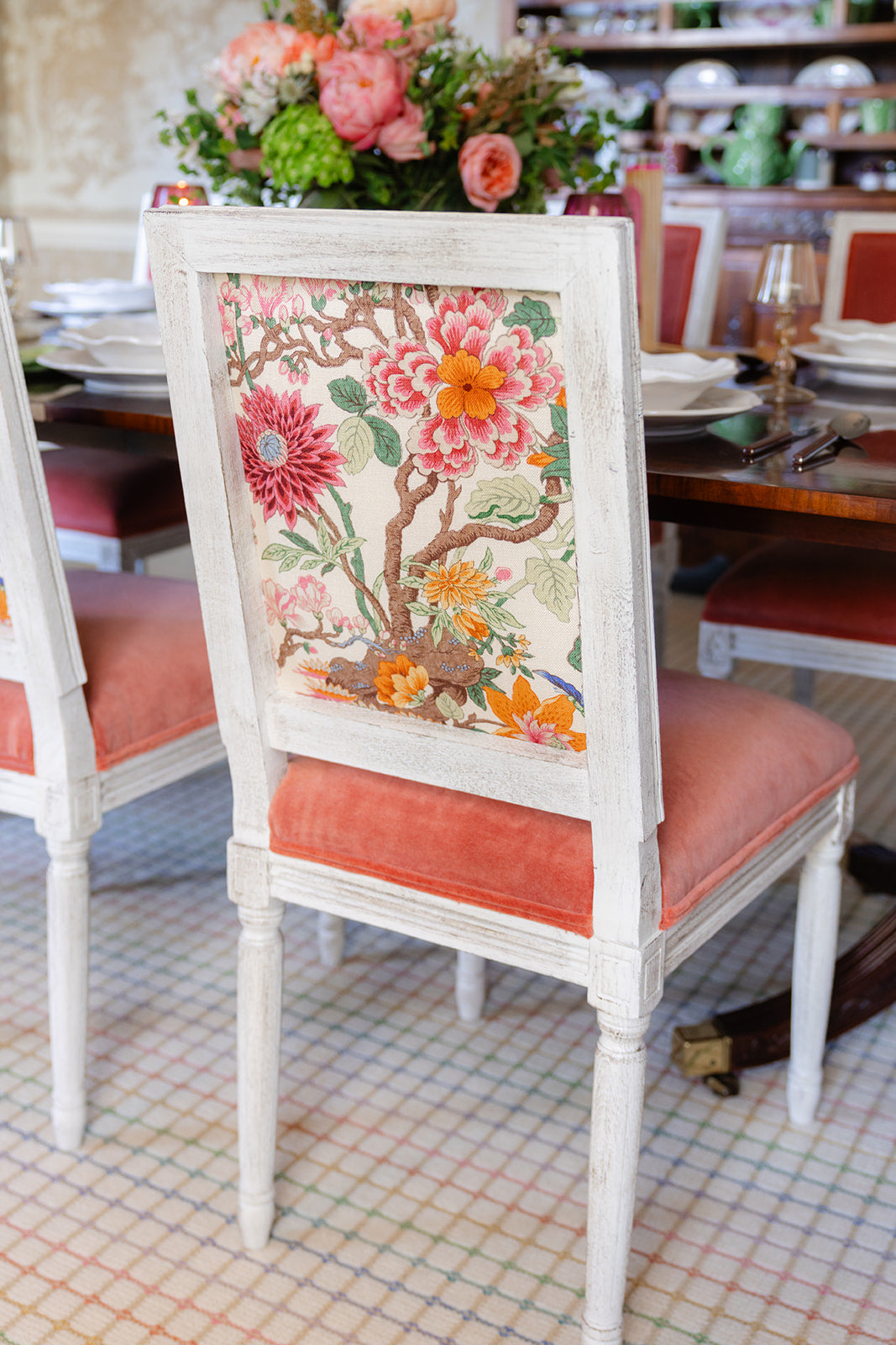 The Tara Dining Chair, created in partnership with Darby Clark, pairs a timeless silhouette with bold, layered upholstery. Finished in antique white, the frame highlights graceful lines while a vibrant floral by GP&J Baker on the back adds a playful pop of pattern. The seat and inner back are upholstered in rich velvet, creating a striking mix of texture and color that brings effortless charm to any dining space.