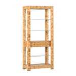 Our Theodore Bookshelf features four “L” shaped uprights, thick low-iron glass shelves, and one storage drawer placed at bar height for functionality; Clear finish on Mappa burl veneer