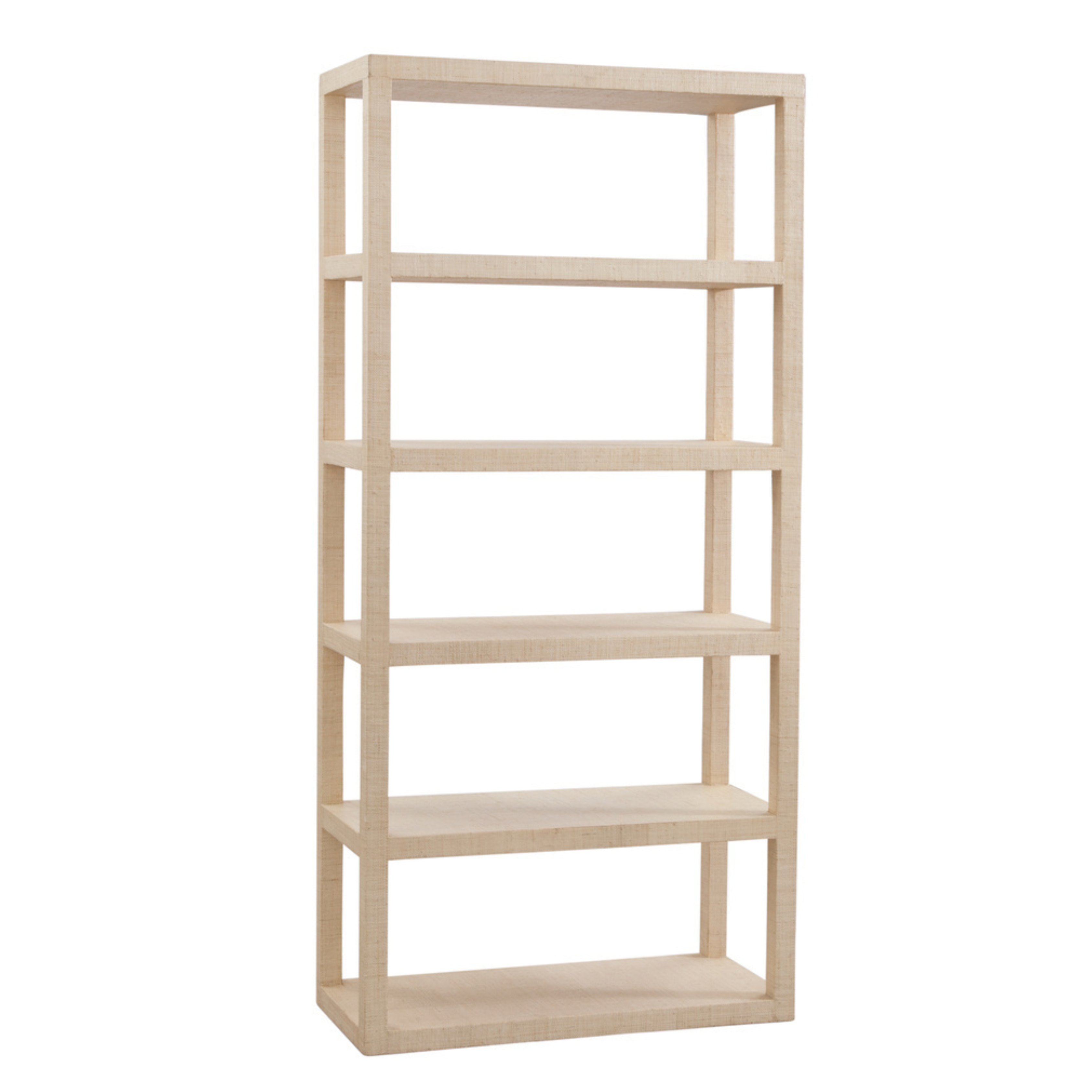 The Victoria Etagere is a testament to coastal boho charm, featuring a solid wood frame enveloped in raffia. Its clear, stain-resistant top coat preserves its natural beauty while ensuring practicality. With tall storage shelving boasting five open shelves, it creates an airy ambiance. Its clean lines and neutral beige hue allow for seamless integration into any coastal-inspired decor, bringing versatile style to your home.